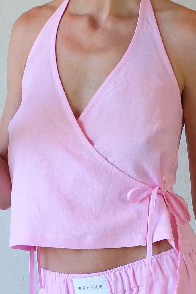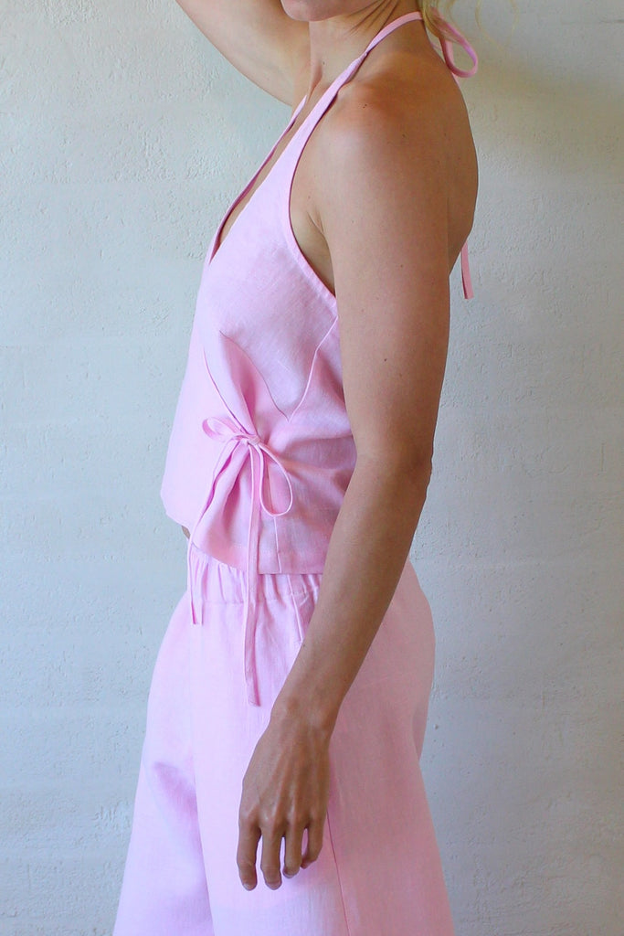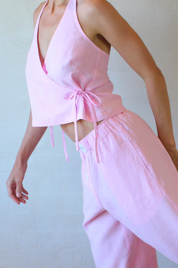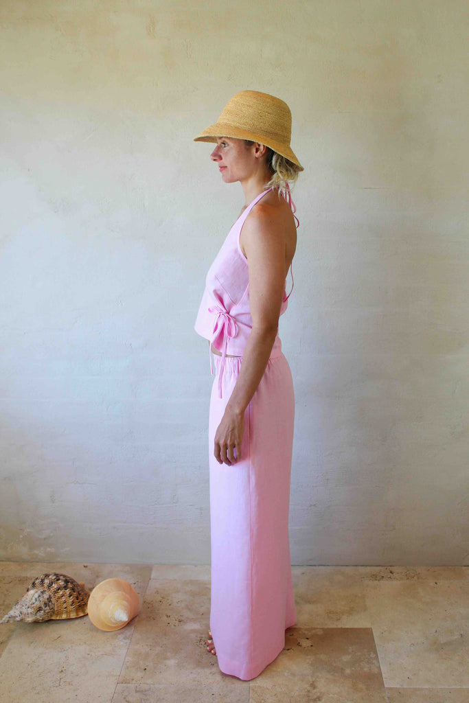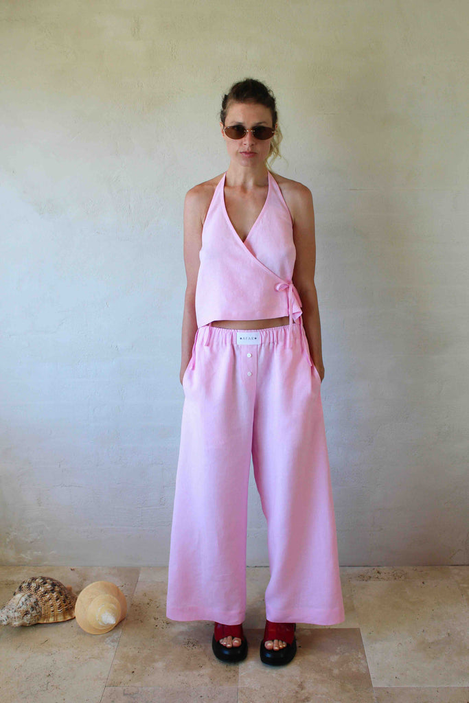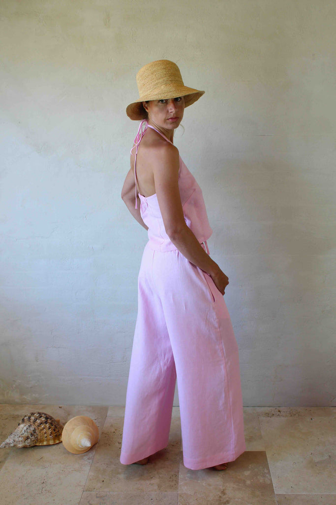 The Lou Top and Leisure Pant in Blush Pink are cut from the same breathable French Flax linen, designed to move together with quiet ease. Sculptural meets soft in a pairing that flows effortlessly from slow mornings to golden-hour gatherings.